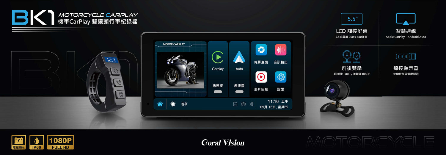 BK1 Motorcycle Dashcam CarPlay Two Camera Line Controller Waterproof IP66